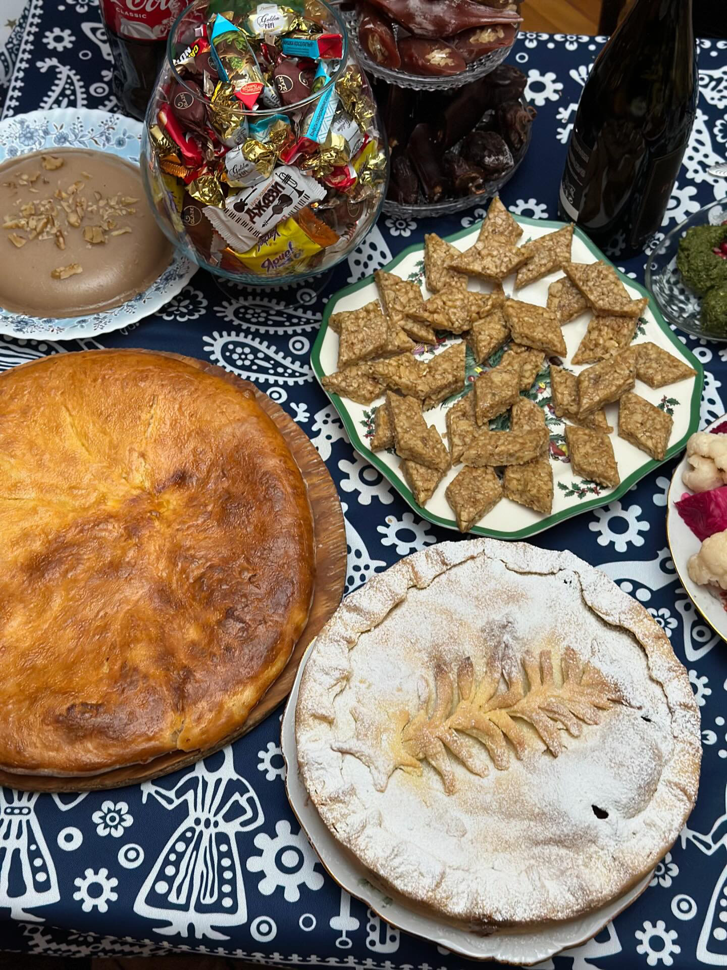 The Georgian Christmas table is a long-awaited celebration of the end of the 40 day religious fast. The star of the table is Satsivi, a rich, aromatic cold walnut sauce served with turkey or chicken that takes hours of careful preparation. Alongside it, in western Georgia, you’ll find Guruli Gvezeli, a special pastry stuffed with cheese and smashed boiled eggs, traditional to the Guria region. For dessert, families share Gozinaki, a crunchy honey and walnut dessert and Churchkhela, nuts dipped in thickened grape juice. All of this delicious food is shared with family members, along with the traditional Georgian wine and toasts.